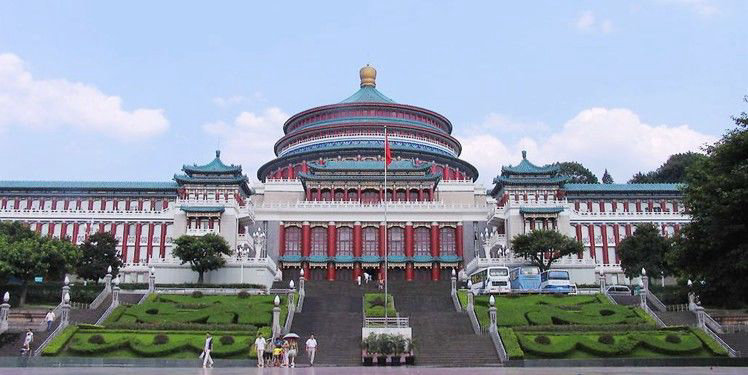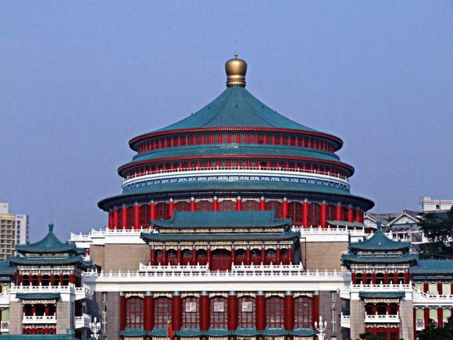 重庆市人民大礼堂,金碧辉煌、气势雄伟,早已成为重庆的标志性建筑。它坐落在重庆市政府左前方。其设计名称为“西南军政大会堂”,竣工定名为“西南行政委员会大礼堂”,西南大区撤销后更为现名。从人民大礼堂的位置和名称上已清楚说明,它天生就是“为人民服务”的,是重庆行政管理的写照。现从以下三点说明之。