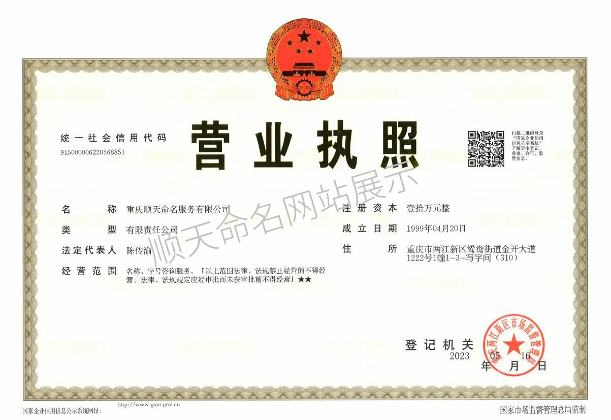 重庆顺天命名服务有限公司成立于1999年,其前身是1997年成立的“陈氏姓名咨询部”,为重庆市首家在国家工商、税务部门登记注册的专业命名机构。2006年在“首届中华姓名文化与品牌策划讨论会”上,被评为“全国十大最具影响力命名策划机构”。
